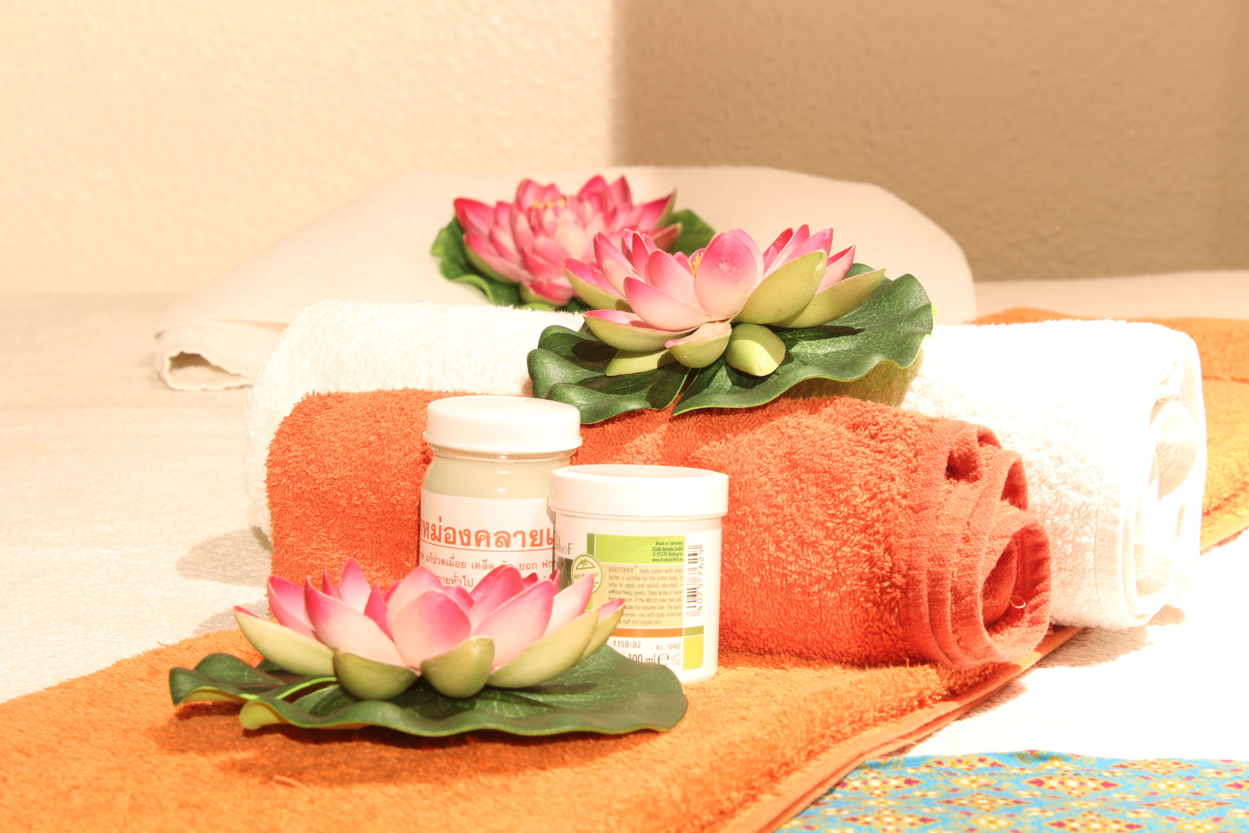 Fernöstliche Massagetechniken – Jahrtausende alt, aber aktuell wie nie. Körperliche und emotionale Blockaden lösen sich, Stress wird abgebaut, die Selbstheilungskräfte des Körpers werden aktiviert. Thaimassage hilft bei Problemen des Bewegungsapparates, Migräne- und anderen Kopfschmerzen, Magen- und Darmproblemen, Erschöpfungszuständen, typischen Bürokrankheiten.